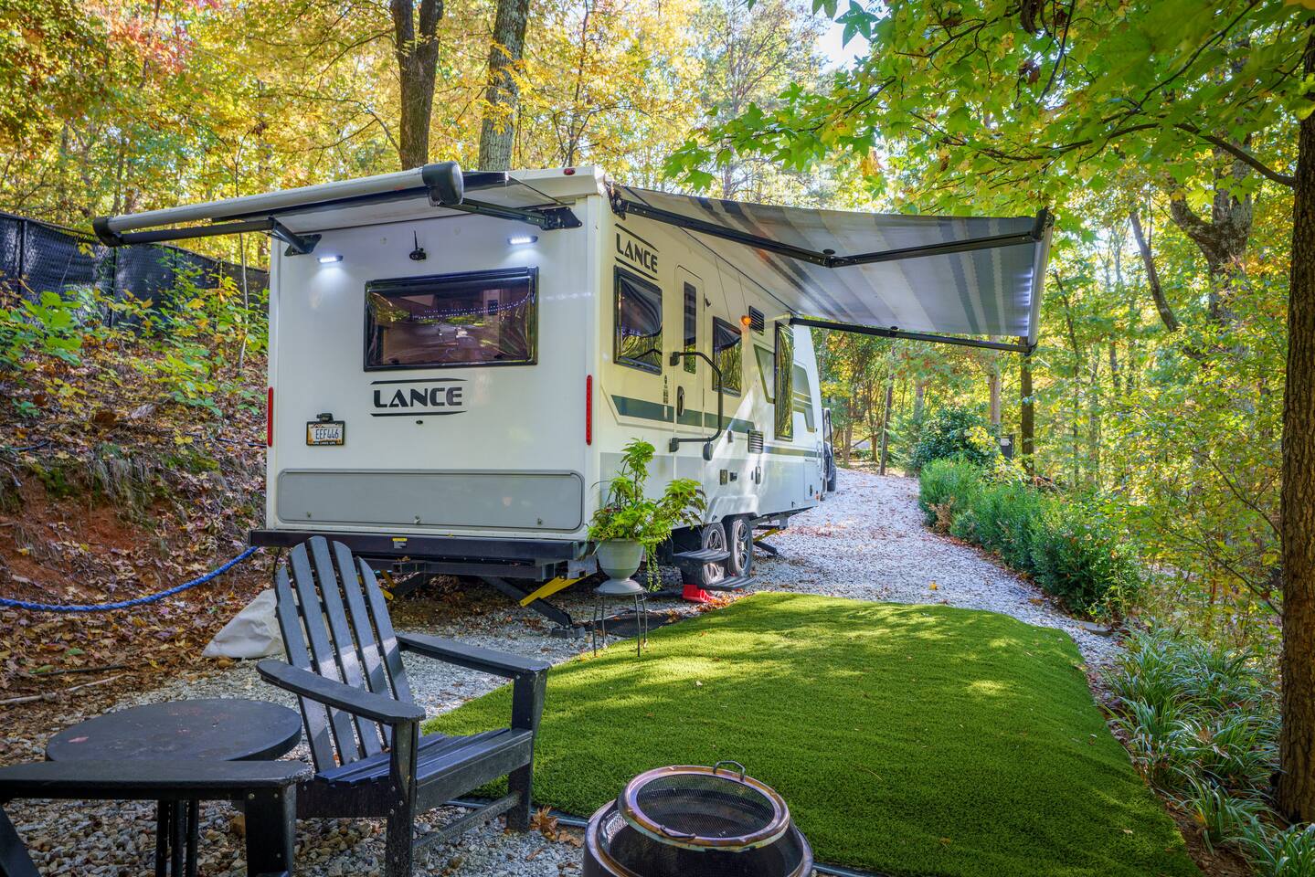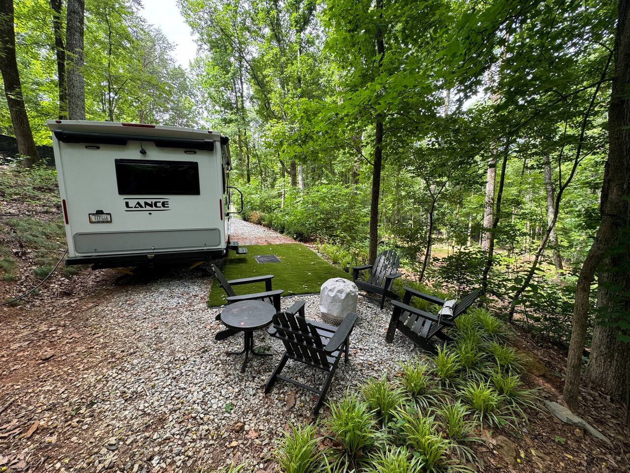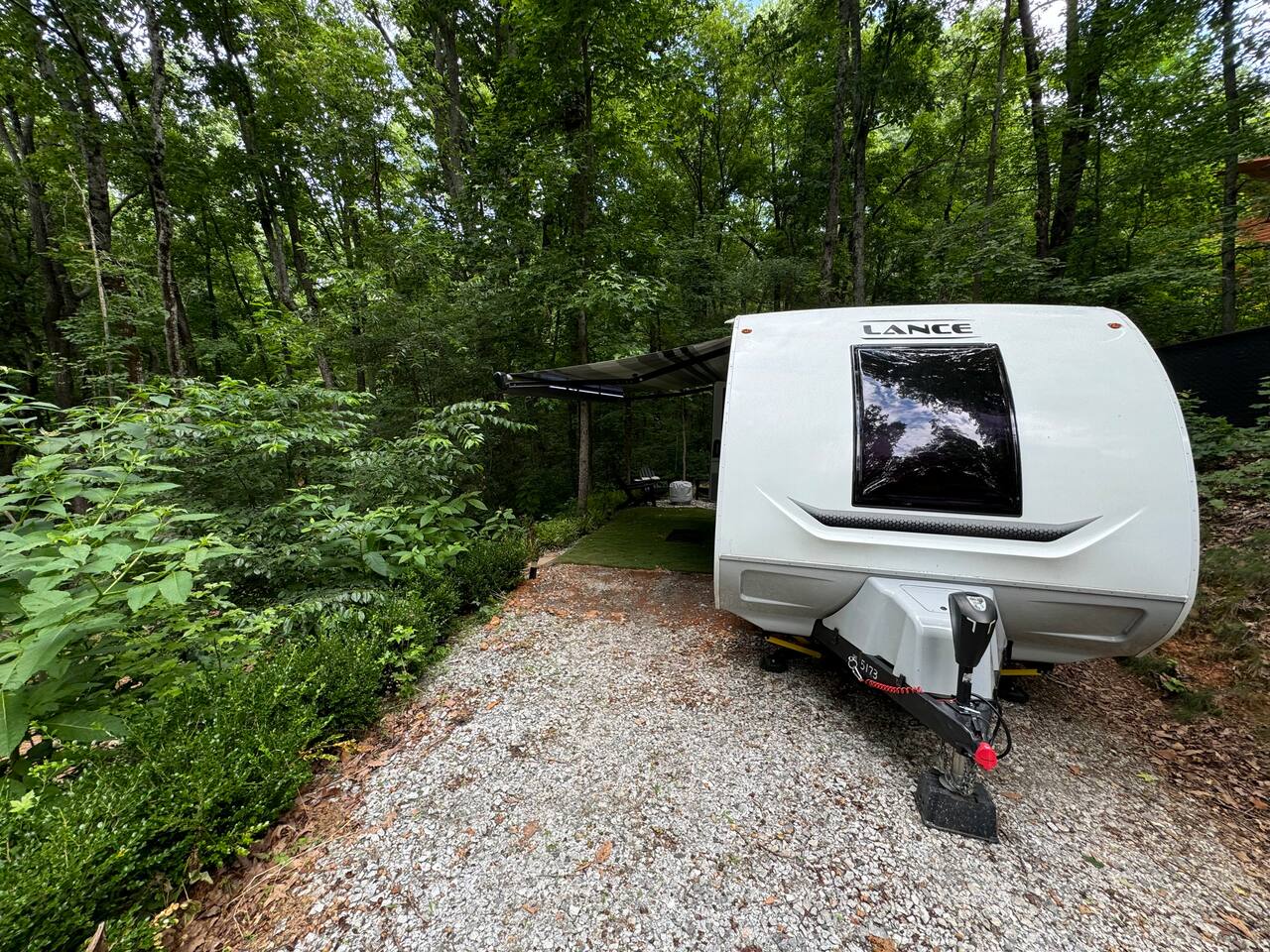 Nature Escape in Greenville, SC Stay @ Chicora Landing, our cozy Lance 2075 RV on the edge of 20 Paris Mountain acres. Enjoy a comfortable queen bed, well equipped kitchen, modern bathroom, outdoor seating, with fire-pit. Visit the nearby farm for fresh produce. Just a short drive to downtown Greenville's Falls Park, Swamp Rabbit Trail, Furman, Travelers Rest and Paris Mountain State Park. Perfect for adventurers, nature lovers, and city slickers alike!