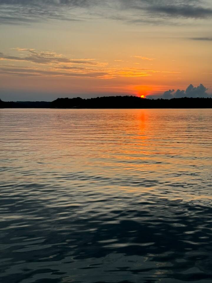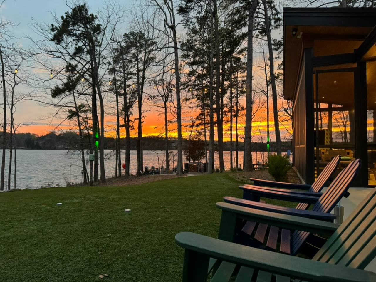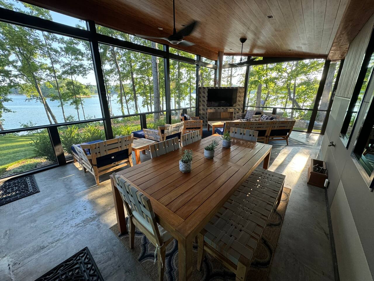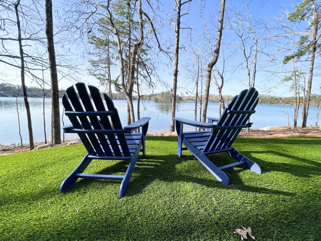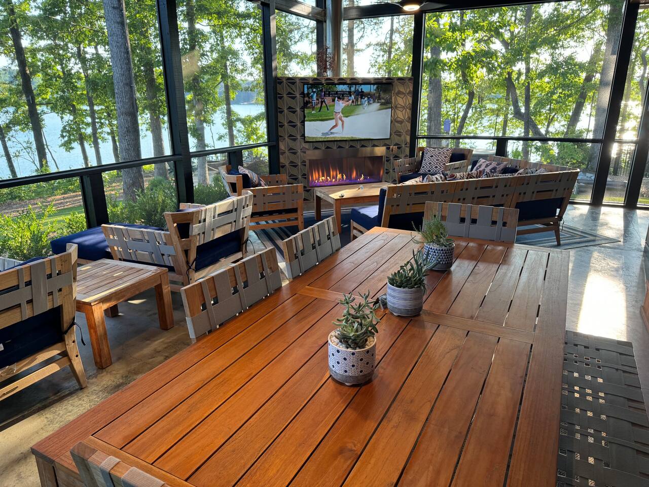Cook and dine in the 1200 square foot great room with a fully equipped kitchen, separate beverage bar, dining table seating 12, kitchen bar seating 6. Afterward, relax on the couch in front of the 36' glass wall looking out on the lake or get closer to nature on the screened porch with fireplace or sit around the outside fire pit only feet from the water's edge where you have excellent views of the sunset over the water. Six bedrooms feature king beds, and a bunk room with 6 bunks and 2 mobile mattresses perfect for the kids and kids at heart alike. Outside features ample parking, 3000SF of turf, and a putting green all surrounded by beautiful trees and the lake. You will also have access to a dock where you can dock your own (or a rental) boat or jetski during your visit. Exterior cameras on and around the house are in use for the security of the property and our guests.