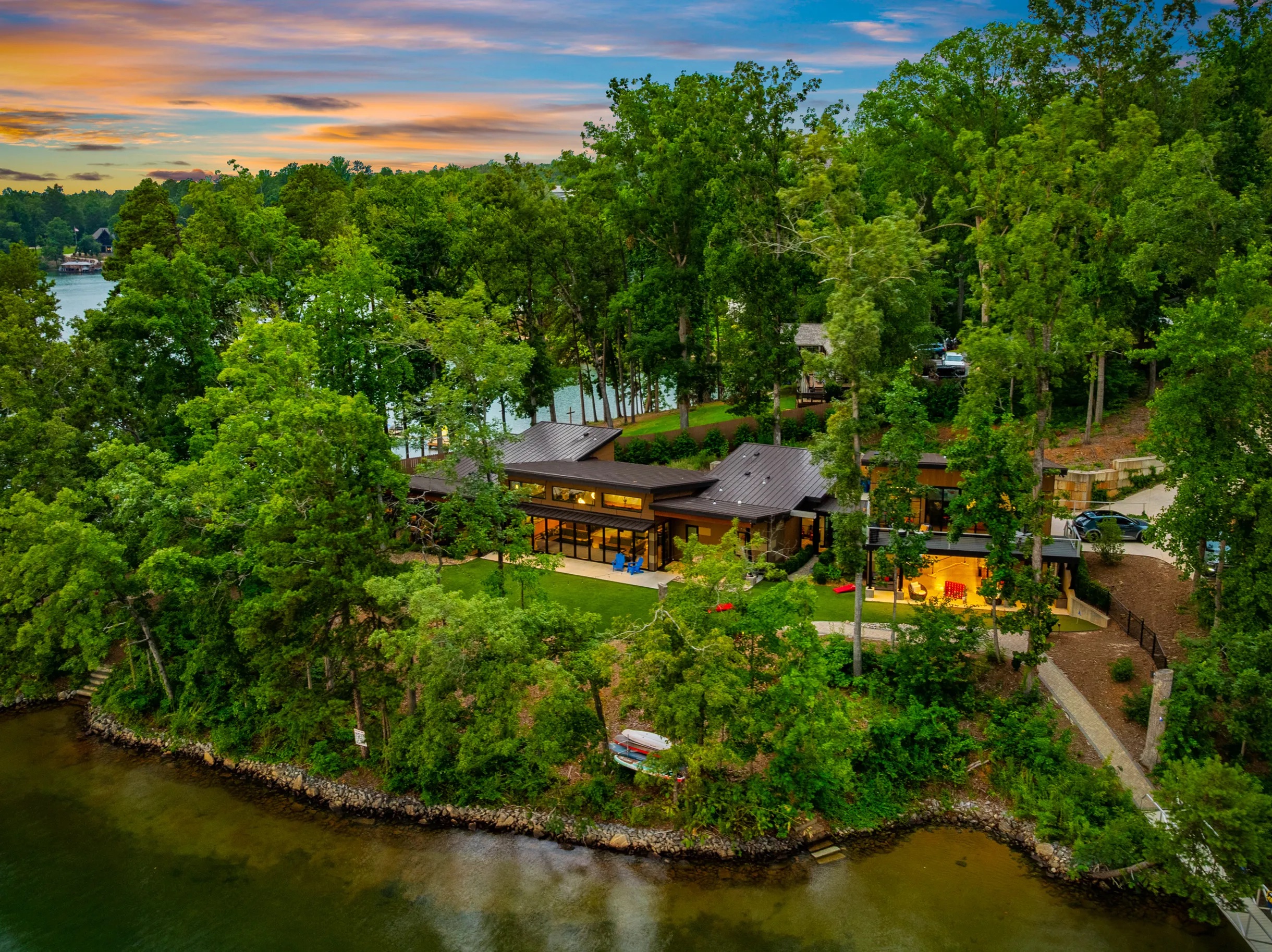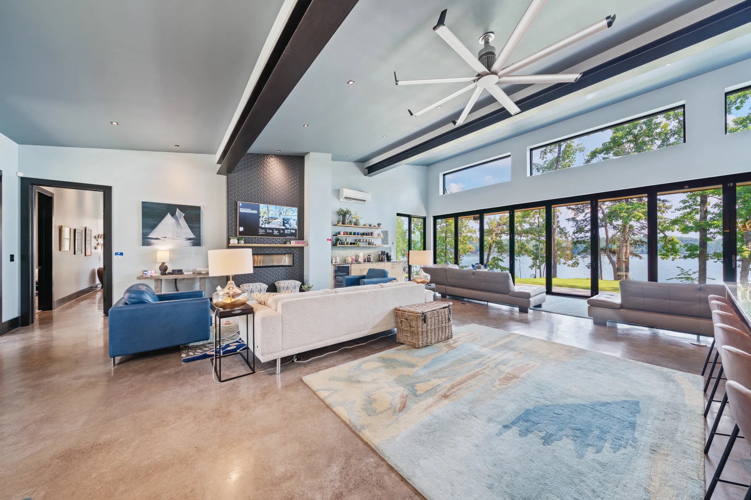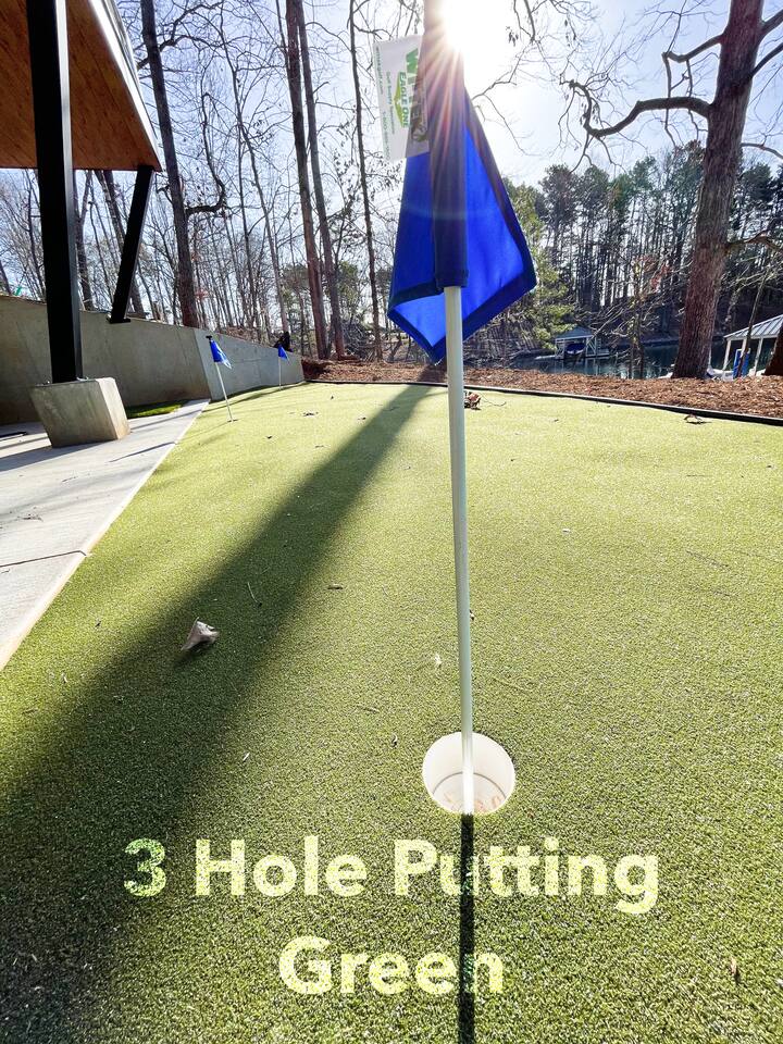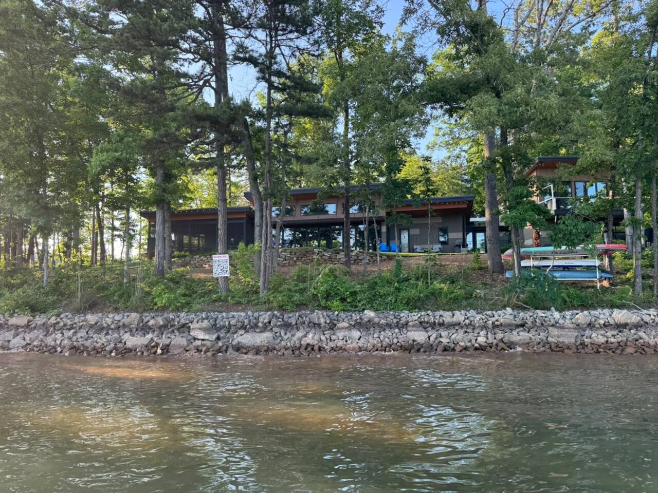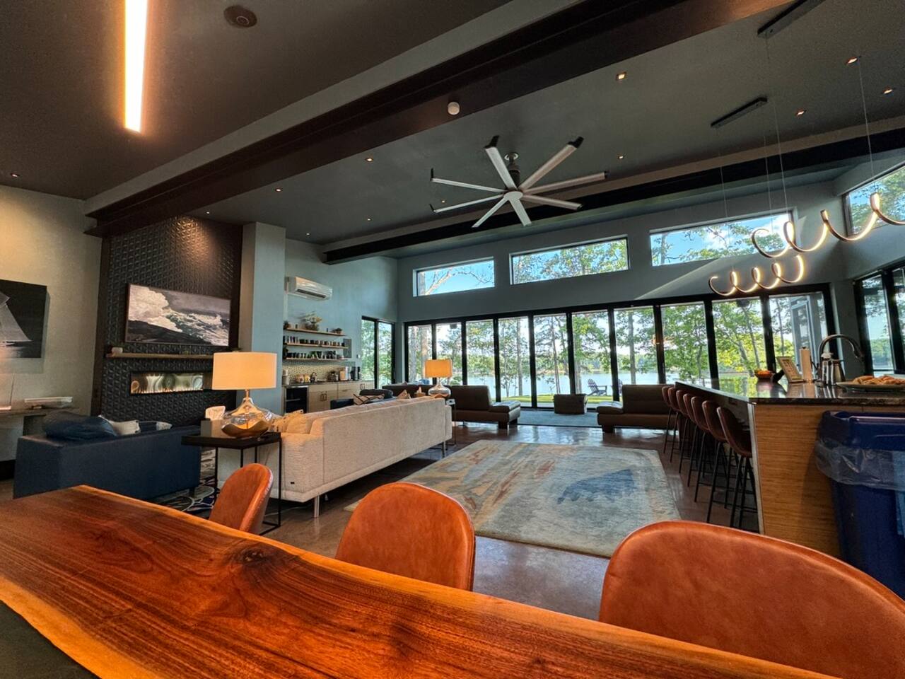 Cook and dine in the 1200 square foot great room with a fully equipped kitchen, separate beverage bar, dining table seating 12, kitchen bar seating 6. Afterward, relax on the couch in front of the 36' glass wall looking out on the lake or get closer to nature on the screened porch with fireplace or sit around the outside fire pit only feet from the water's edge where you have excellent views of the sunset over the water. Six bedrooms feature king beds, and a bunk room with 6 bunks and 2 mobile mattresses perfect for the kids and kids at heart alike. Outside features ample parking, 3000SF of turf, and a putting green all surrounded by beautiful trees and the lake. You will also have access to a dock where you can dock your own (or a rental) boat or jetski during your visit. Exterior cameras on and around the house are in use for the security of the property and our guests.