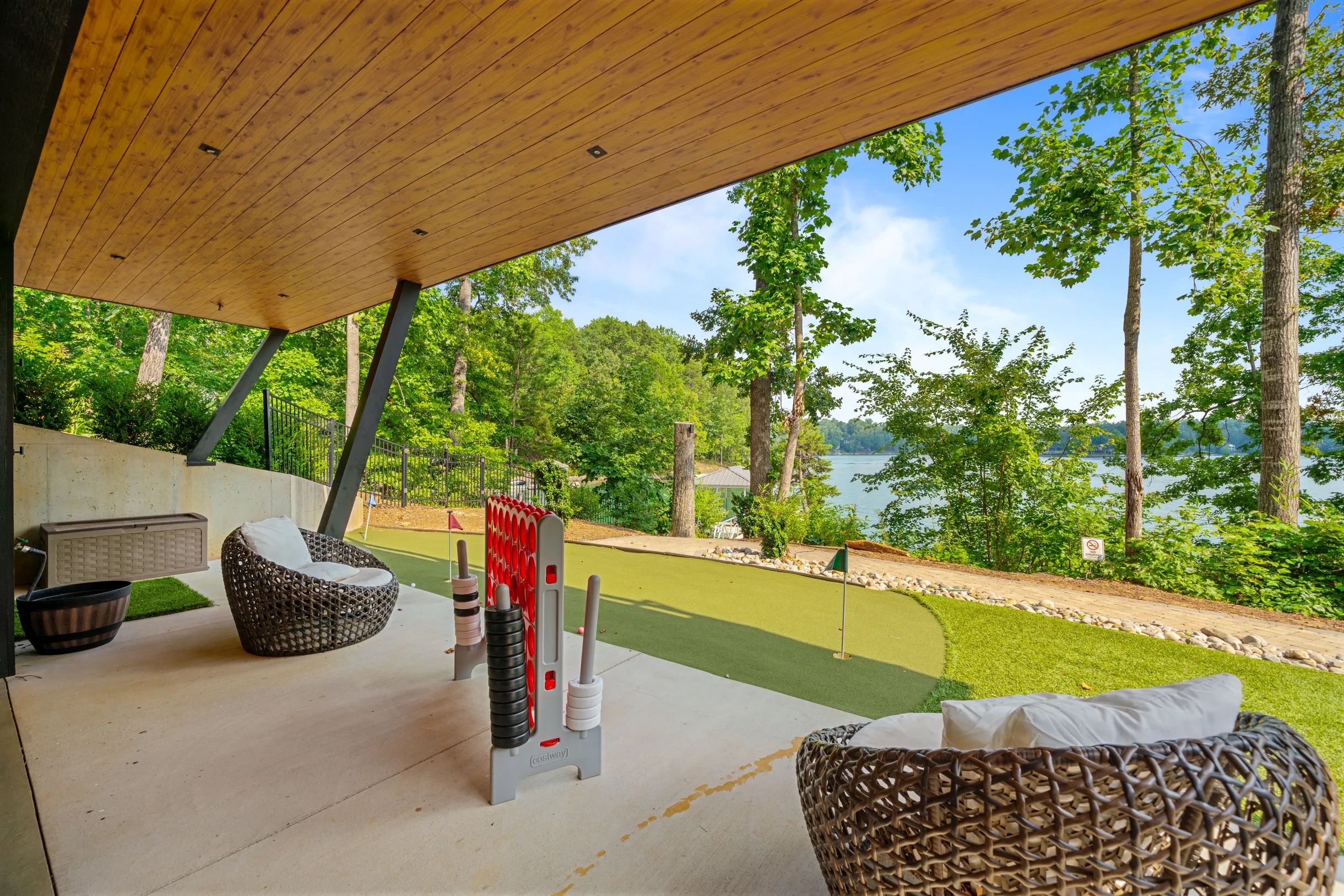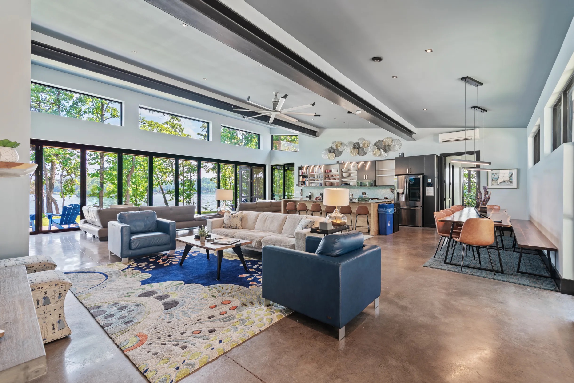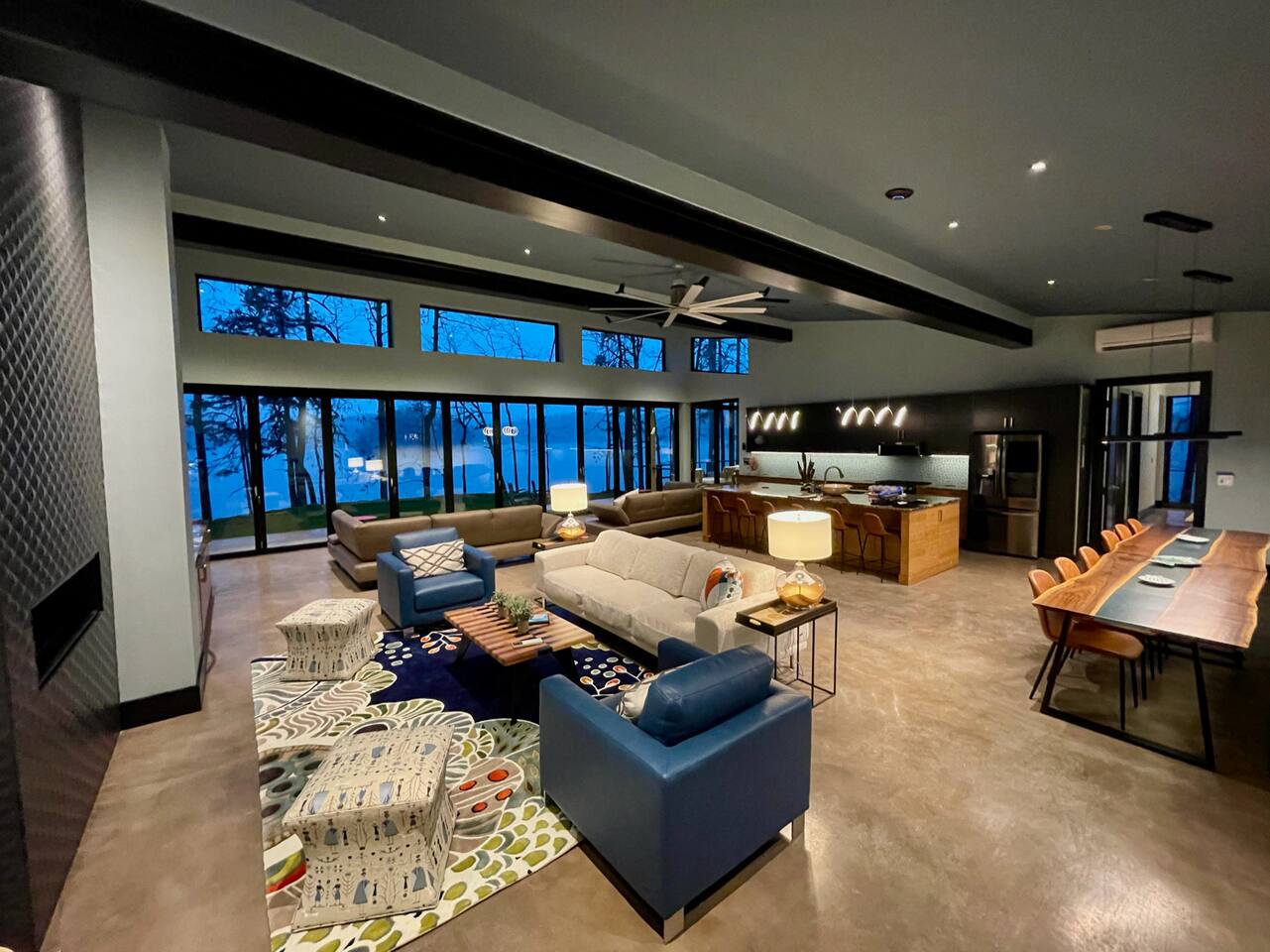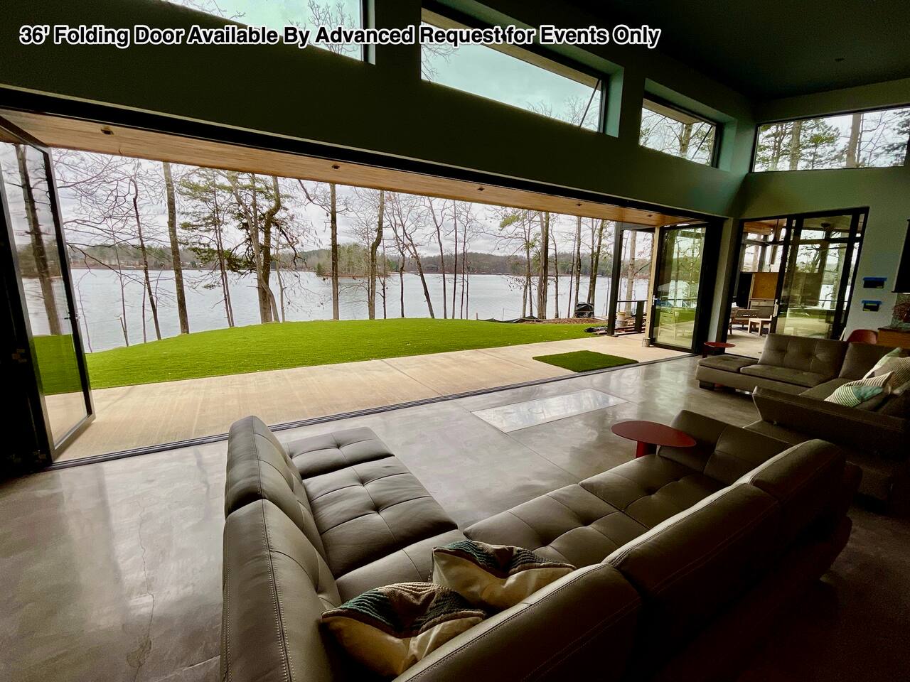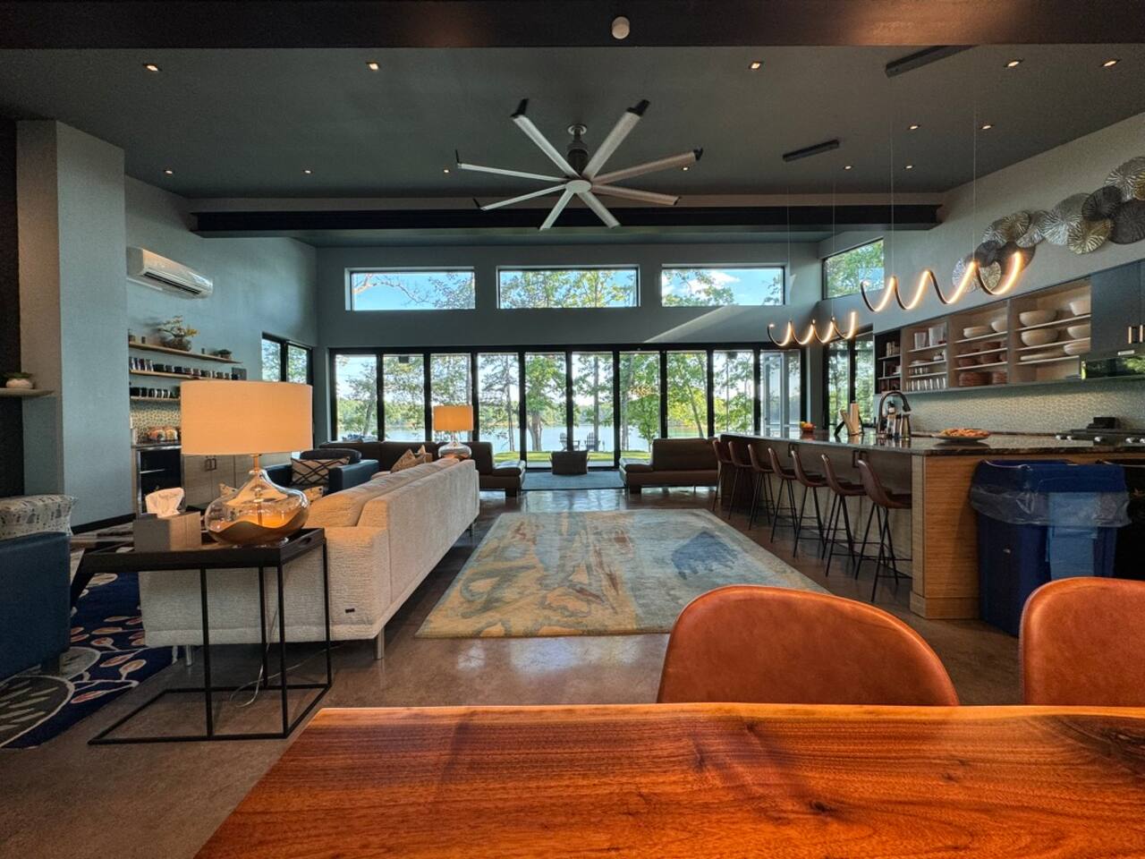 Cook and dine in the 1200 square foot great room with a fully equipped kitchen, separate beverage bar, dining table seating 12, kitchen bar seating 6. Afterward, relax on the couch in front of the 36' glass wall looking out on the lake or get closer to nature on the screened porch with fireplace or sit around the outside fire pit only feet from the water's edge where you have excellent views of the sunset over the water. Six bedrooms feature king beds, and a bunk room with 6 bunks and 2 mobile mattresses perfect for the kids and kids at heart alike. Outside features ample parking, 3000SF of turf, and a putting green all surrounded by beautiful trees and the lake. You will also have access to a dock where you can dock your own (or a rental) boat or jetski during your visit. Exterior cameras on and around the house are in use for the security of the property and our guests.