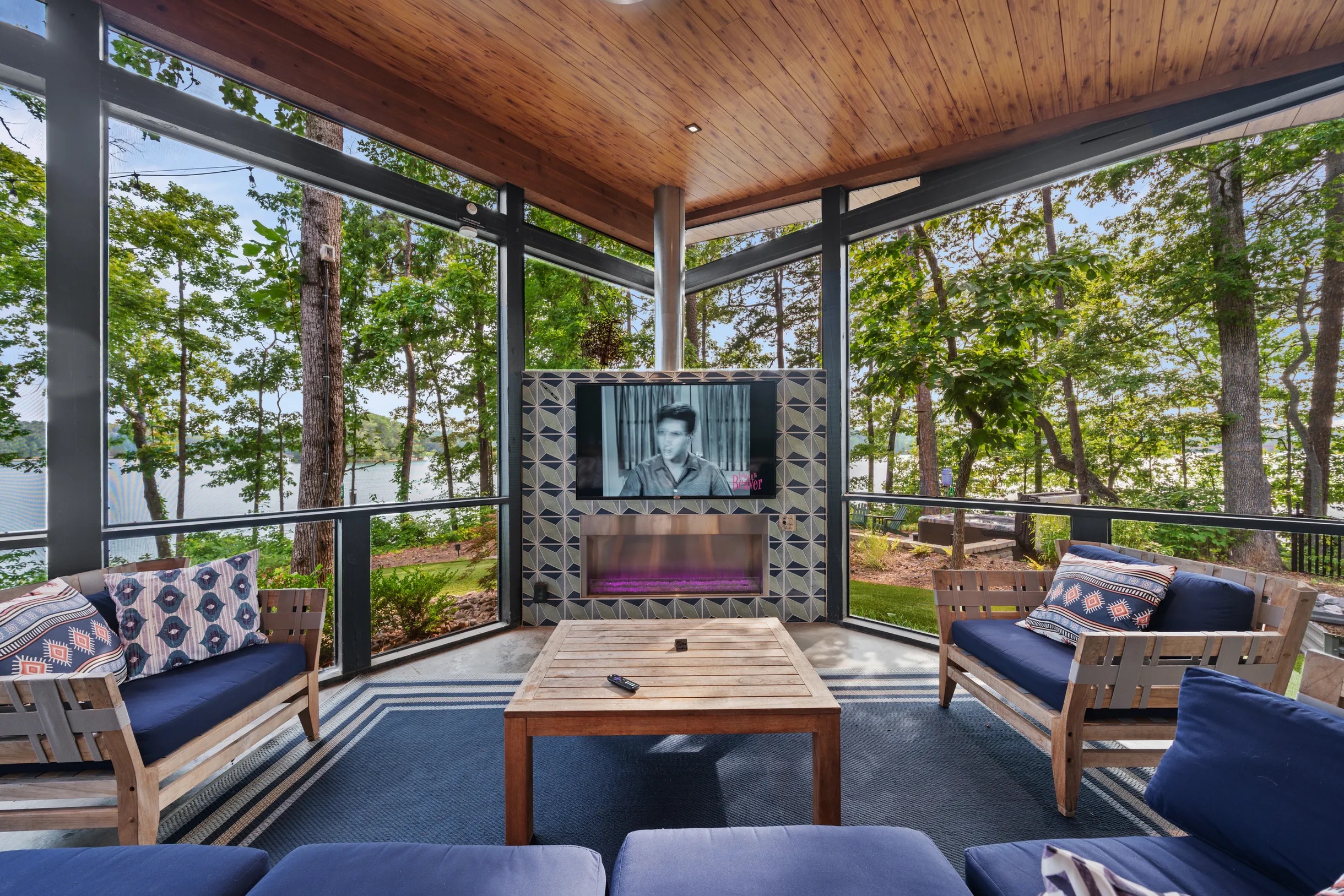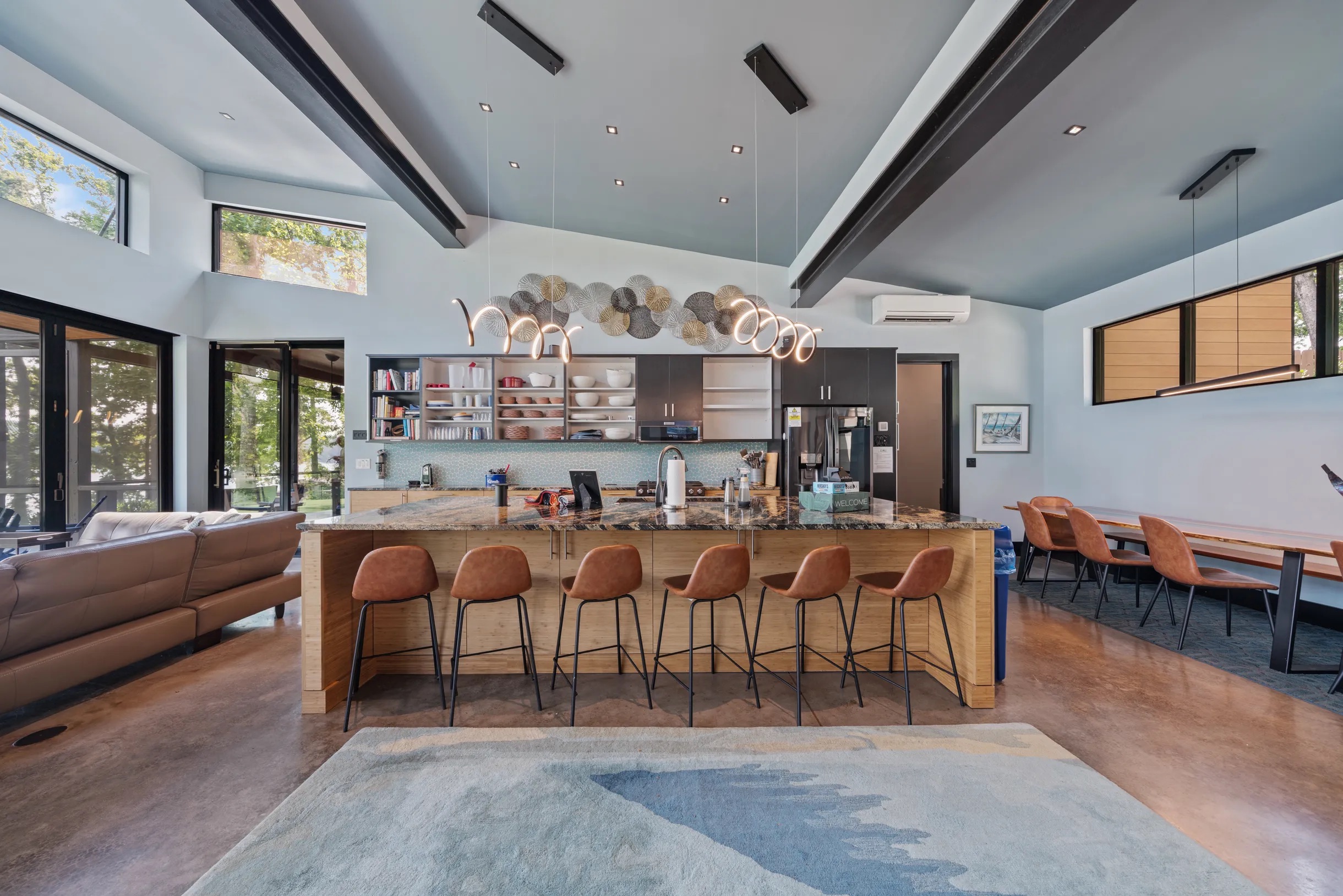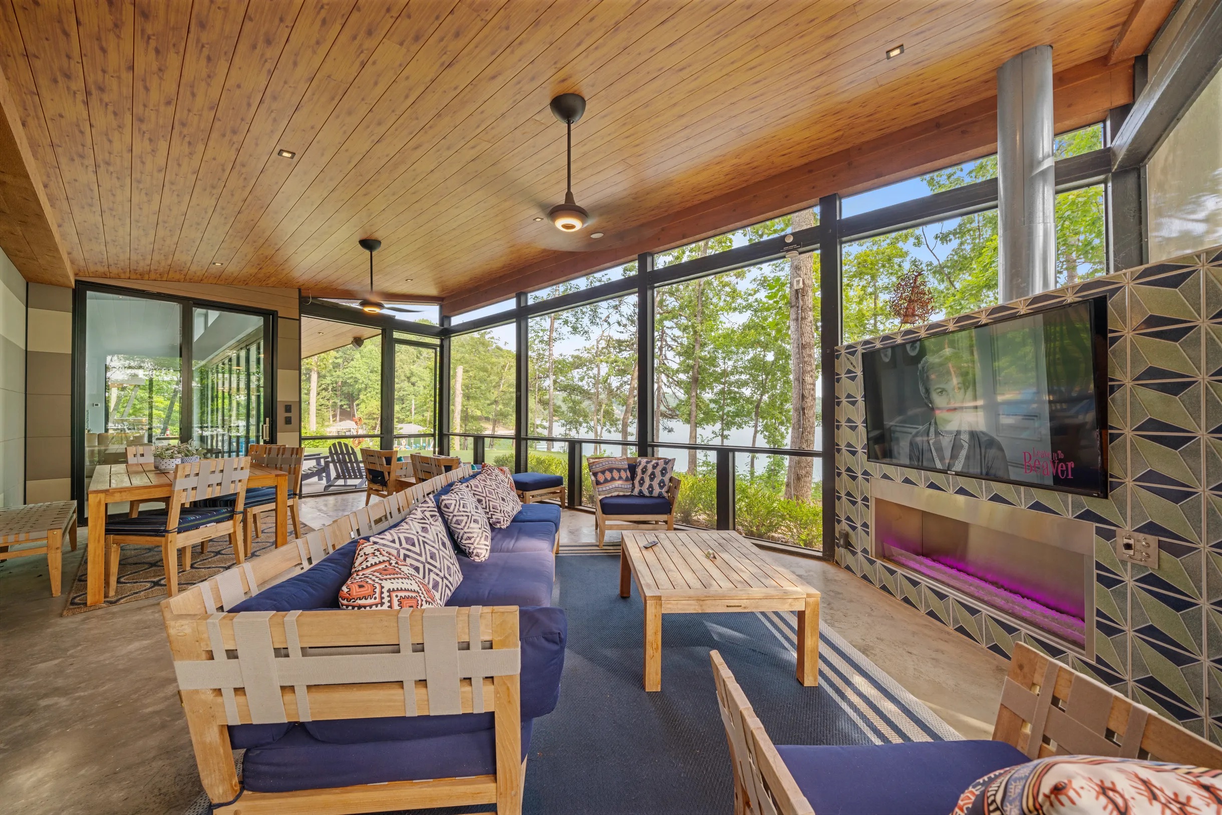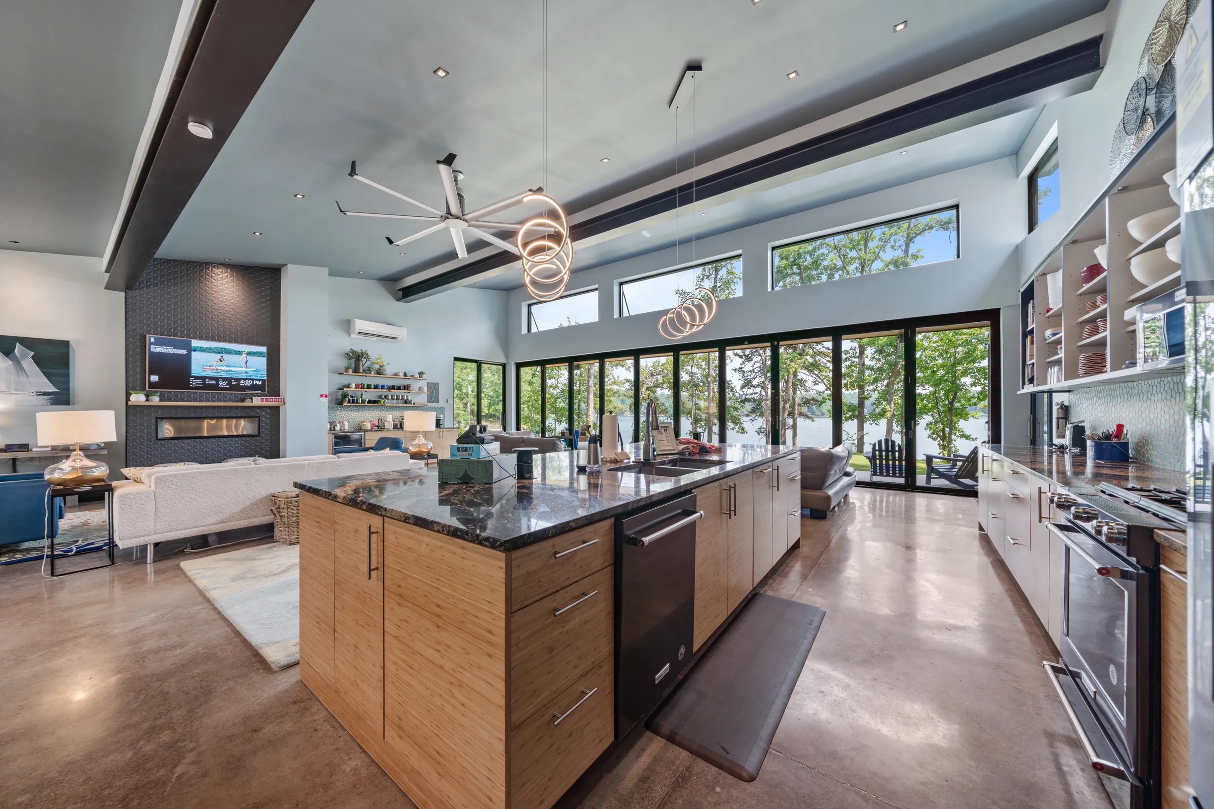 Cook and dine in the 1200 square foot great room with a fully equipped kitchen, separate beverage bar, dining table seating 12, kitchen bar seating 6. Afterward, relax on the couch in front of the 36' glass wall looking out on the lake or get closer to nature on the screened porch with fireplace or sit around the outside fire pit only feet from the water's edge where you have excellent views of the sunset over the water. Six bedrooms feature king beds, and a bunk room with 6 bunks and 2 mobile mattresses perfect for the kids and kids at heart alike. Outside features ample parking, 3000SF of turf, and a putting green all surrounded by beautiful trees and the lake. You will also have access to a dock where you can dock your own (or a rental) boat or jetski during your visit. Exterior cameras on and around the house are in use for the security of the property and our guests.