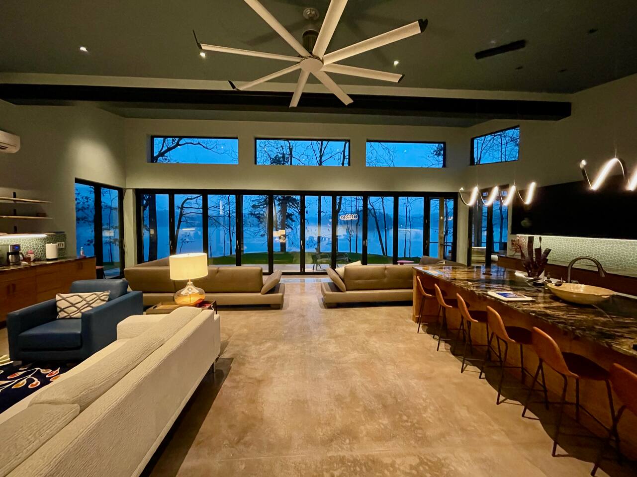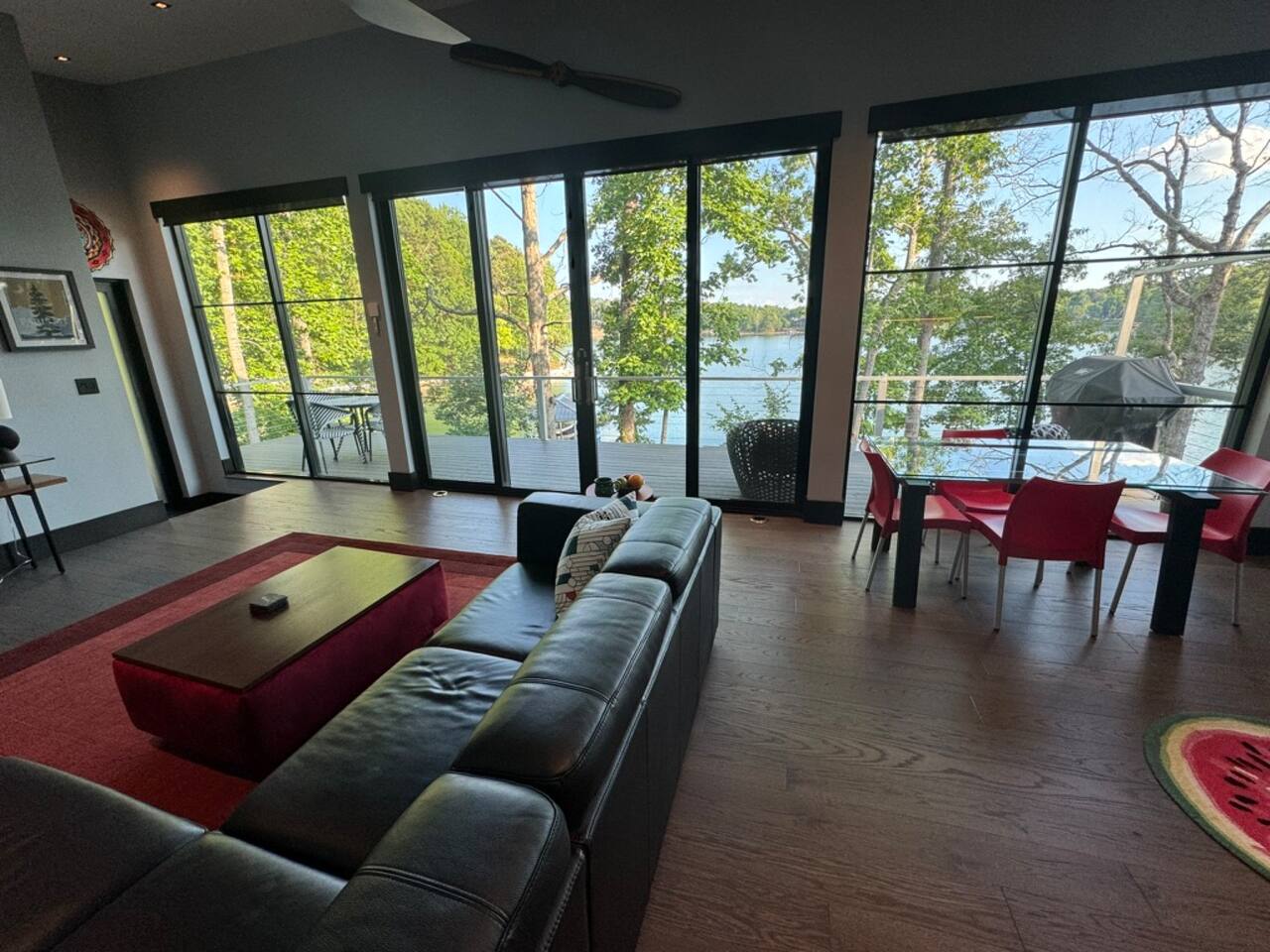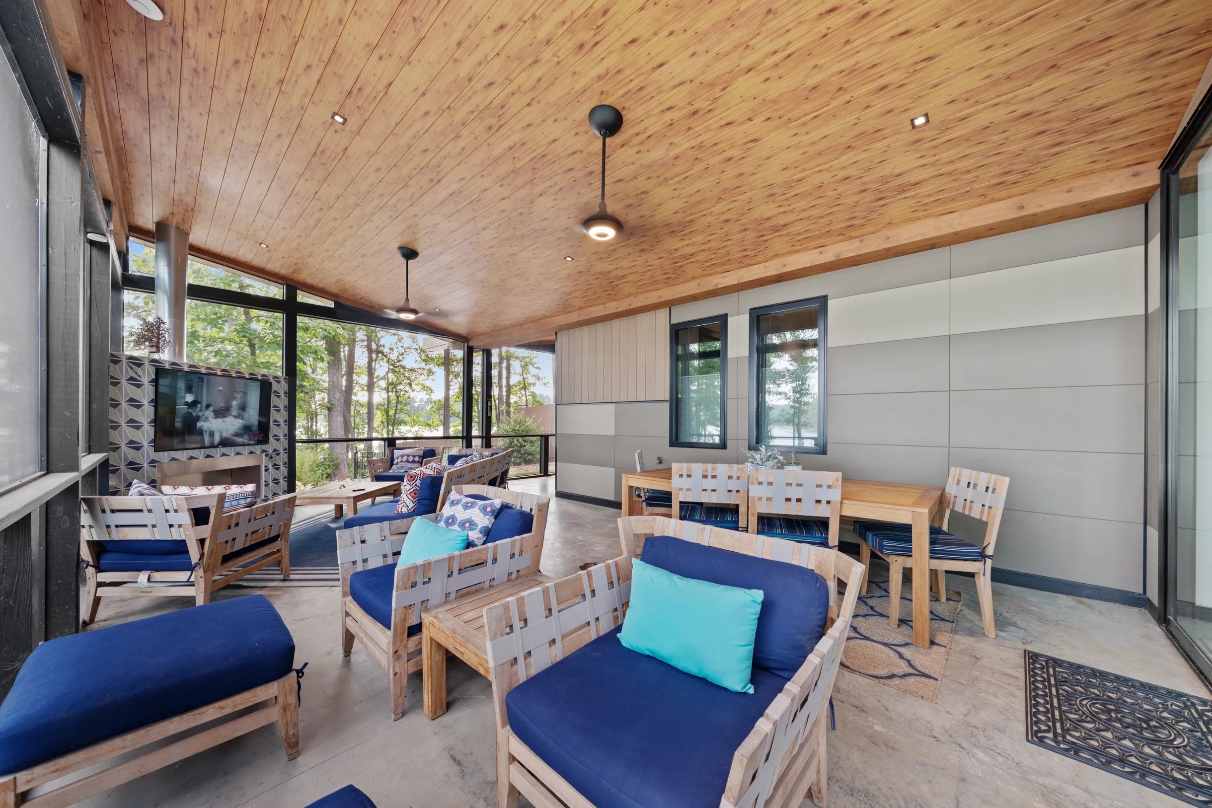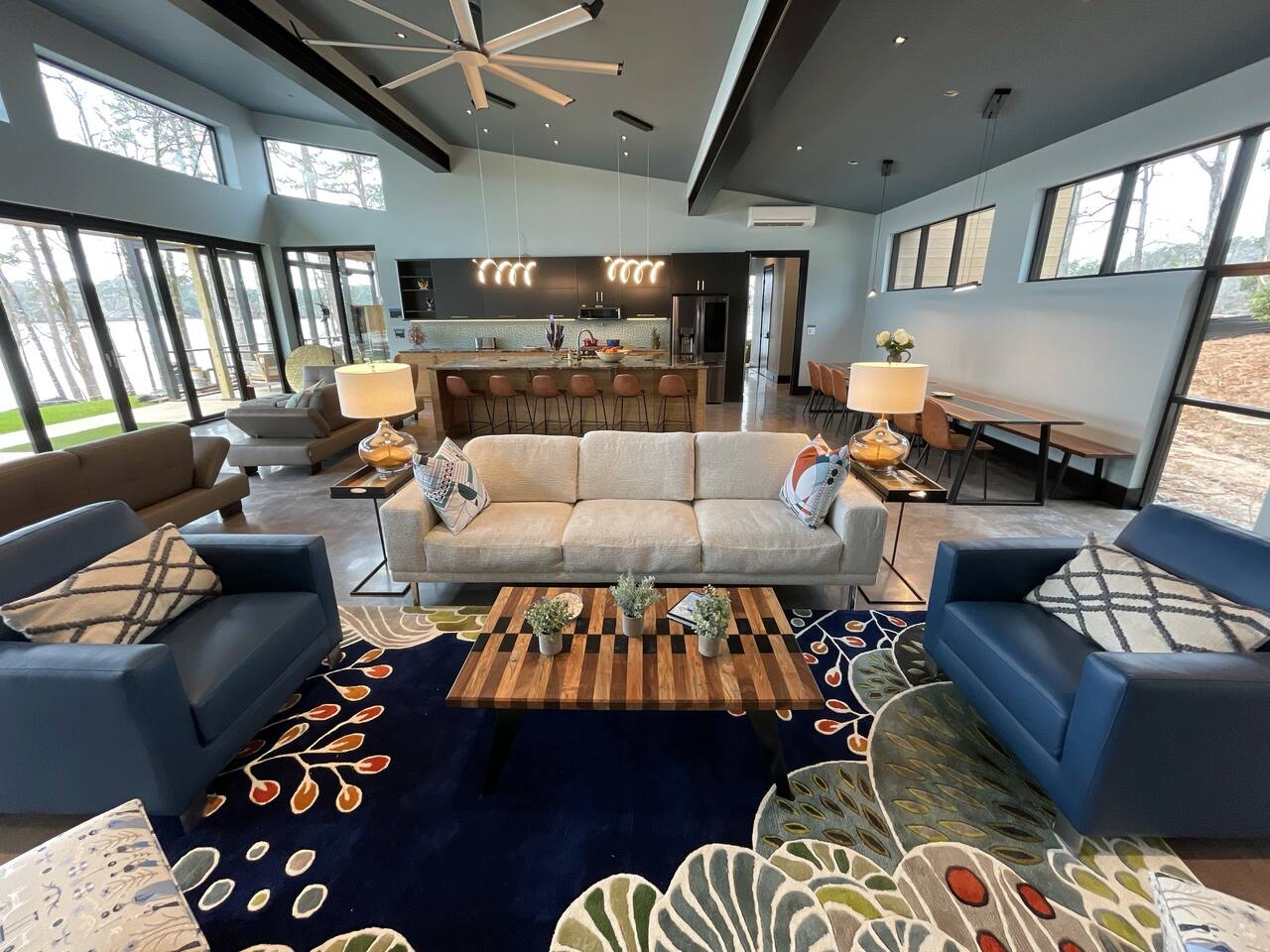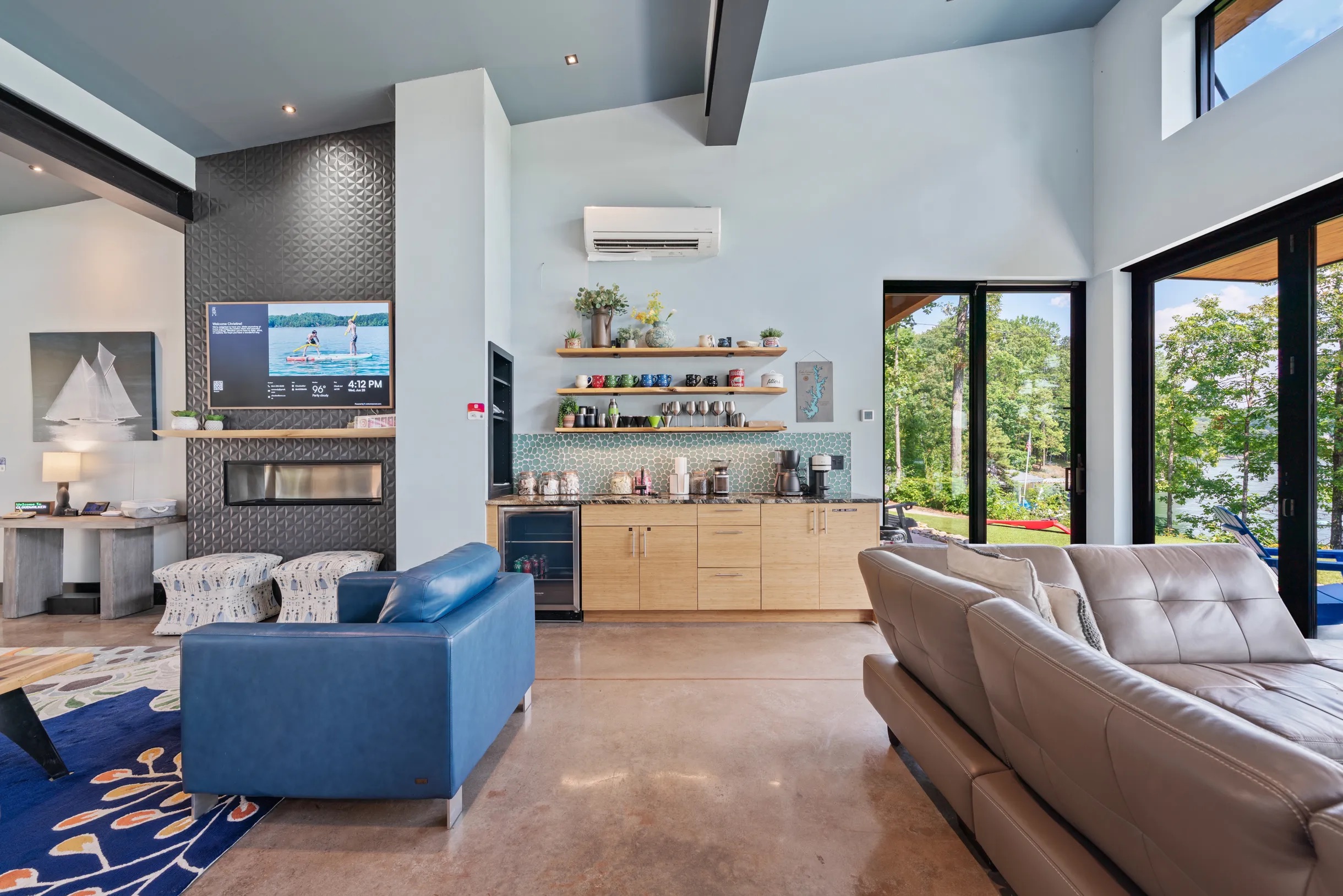 Cook and dine in the 1200 square foot great room with a fully equipped kitchen, separate beverage bar, dining table seating 12, kitchen bar seating 6. Afterward, relax on the couch in front of the 36' glass wall looking out on the lake or get closer to nature on the screened porch with fireplace or sit around the outside fire pit only feet from the water's edge where you have excellent views of the sunset over the water. Six bedrooms feature king beds, and a bunk room with 6 bunks and 2 mobile mattresses perfect for the kids and kids at heart alike. Outside features ample parking, 3000SF of turf, and a putting green all surrounded by beautiful trees and the lake. You will also have access to a dock where you can dock your own (or a rental) boat or jetski during your visit. Exterior cameras on and around the house are in use for the security of the property and our guests.