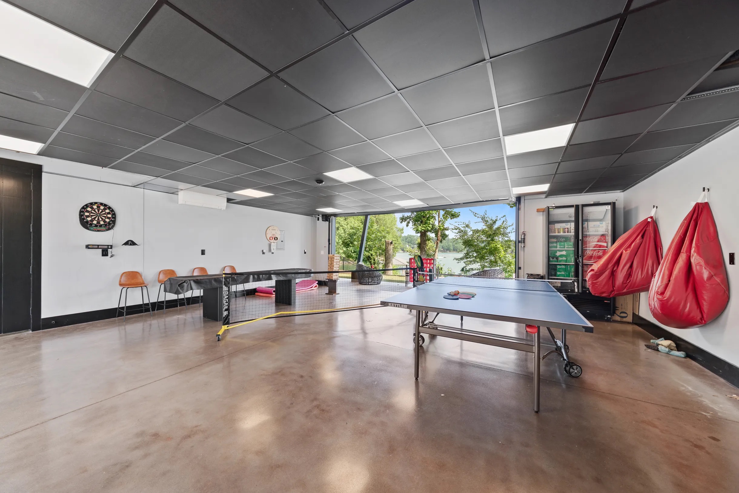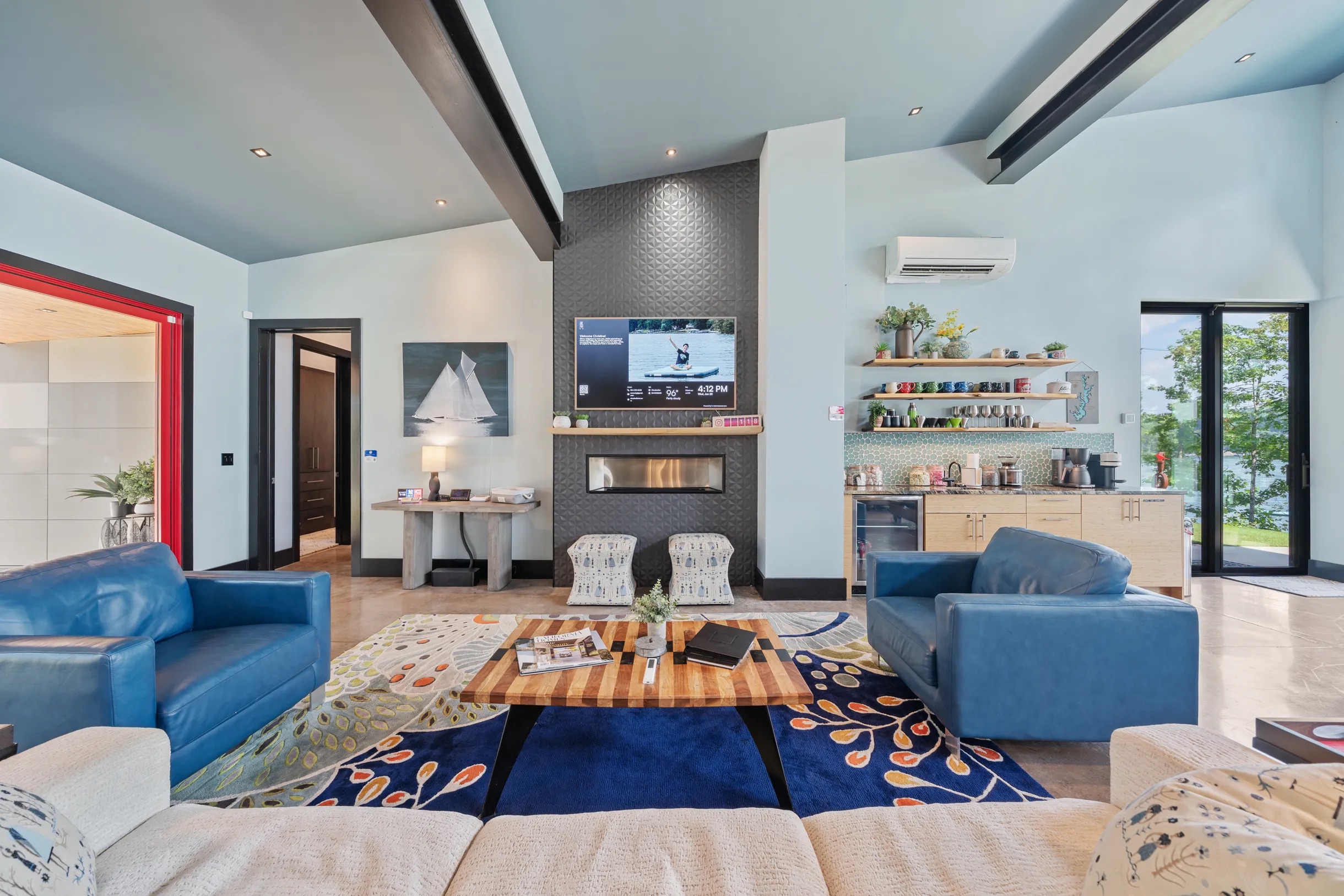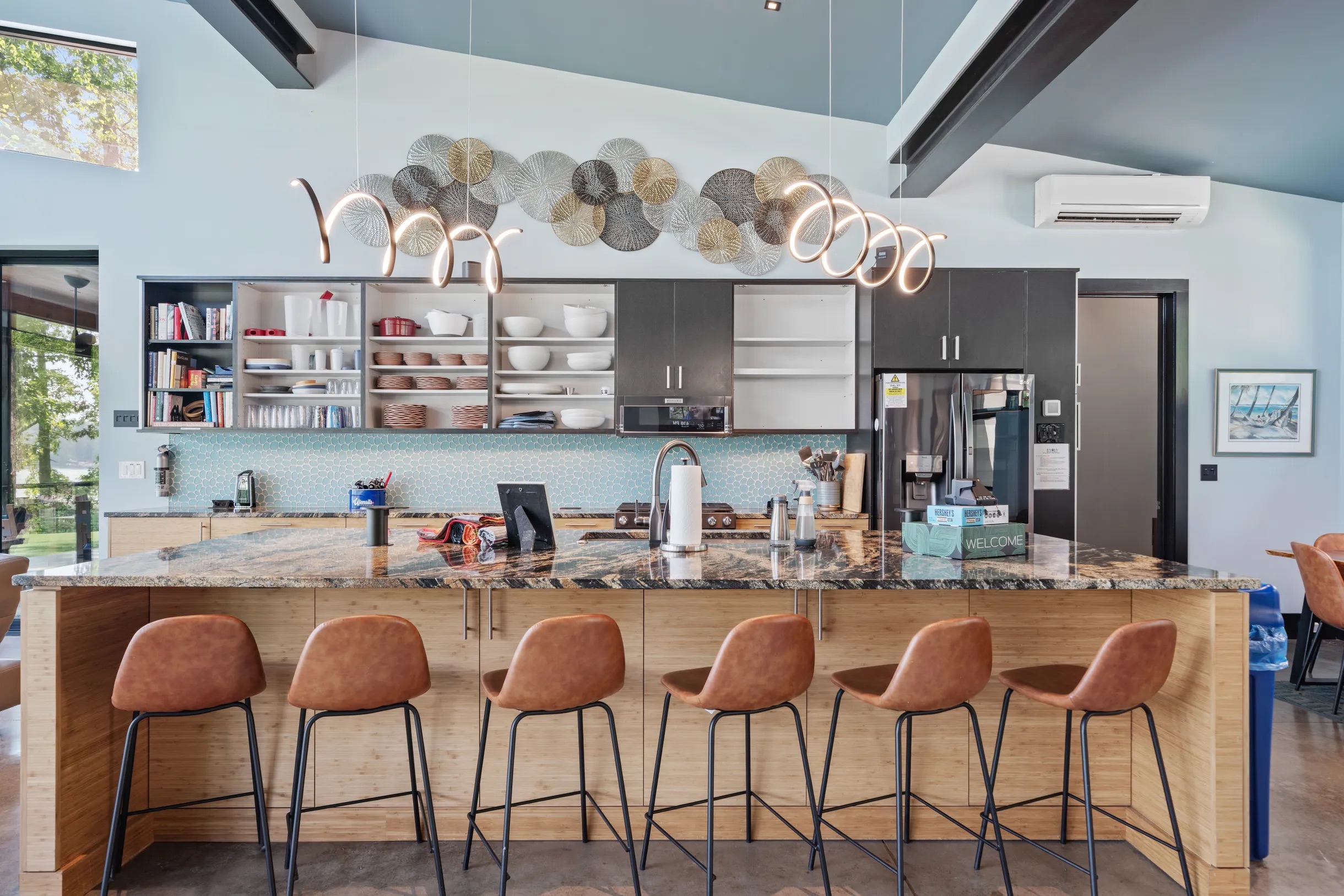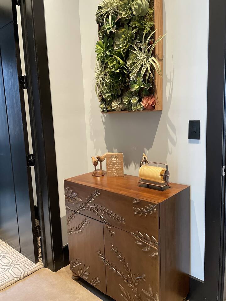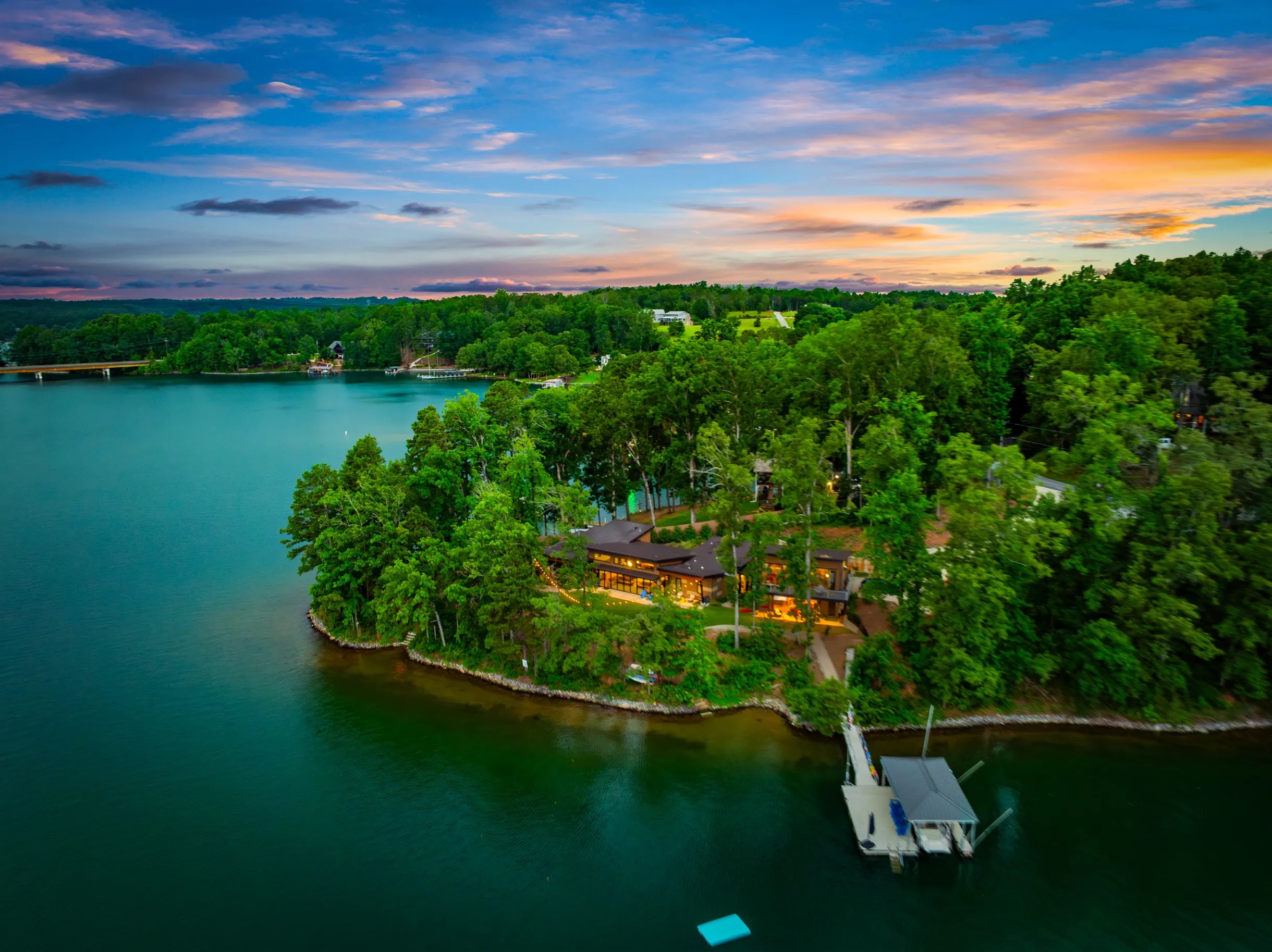 Cook and dine in the 1200 square foot great room with a fully equipped kitchen, separate beverage bar, dining table seating 12, kitchen bar seating 6. Afterward, relax on the couch in front of the 36' glass wall looking out on the lake or get closer to nature on the screened porch with fireplace or sit around the outside fire pit only feet from the water's edge where you have excellent views of the sunset over the water. Six bedrooms feature king beds, and a bunk room with 6 bunks and 2 mobile mattresses perfect for the kids and kids at heart alike. Outside features ample parking, 3000SF of turf, and a putting green all surrounded by beautiful trees and the lake. You will also have access to a dock where you can dock your own (or a rental) boat or jetski during your visit. Exterior cameras on and around the house are in use for the security of the property and our guests.