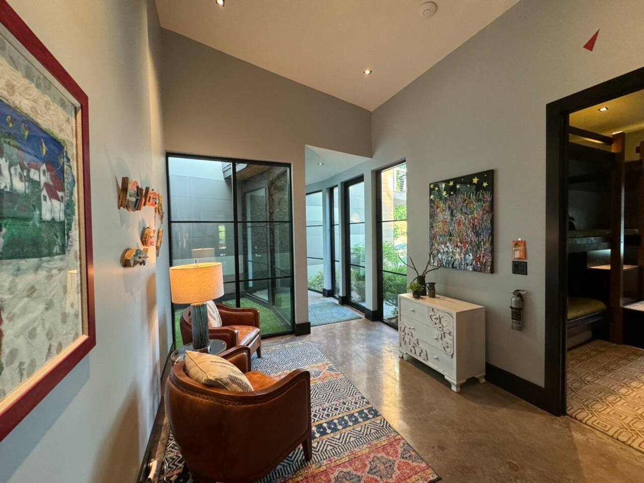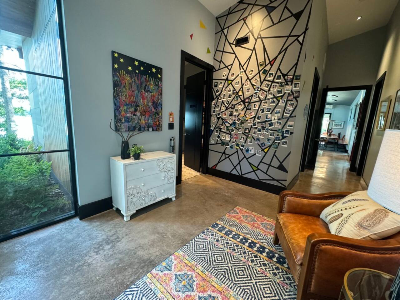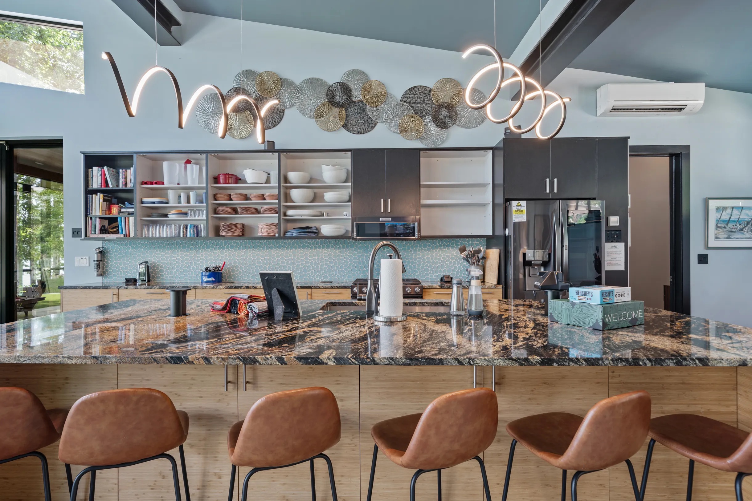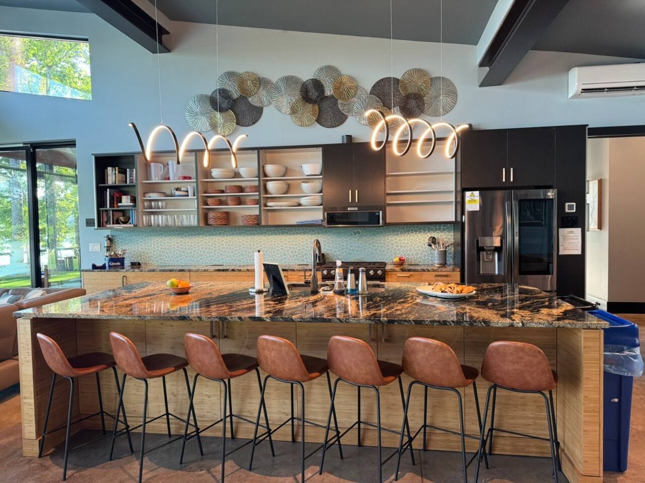 Cook and dine in the 1200 square foot great room with a fully equipped kitchen, separate beverage bar, dining table seating 12, kitchen bar seating 6. Afterward, relax on the couch in front of the 36' glass wall looking out on the lake or get closer to nature on the screened porch with fireplace or sit around the outside fire pit only feet from the water's edge where you have excellent views of the sunset over the water. Six bedrooms feature king beds, and a bunk room with 6 bunks and 2 mobile mattresses perfect for the kids and kids at heart alike. Outside features ample parking, 3000SF of turf, and a putting green all surrounded by beautiful trees and the lake. You will also have access to a dock where you can dock your own (or a rental) boat or jetski during your visit. Exterior cameras on and around the house are in use for the security of the property and our guests.