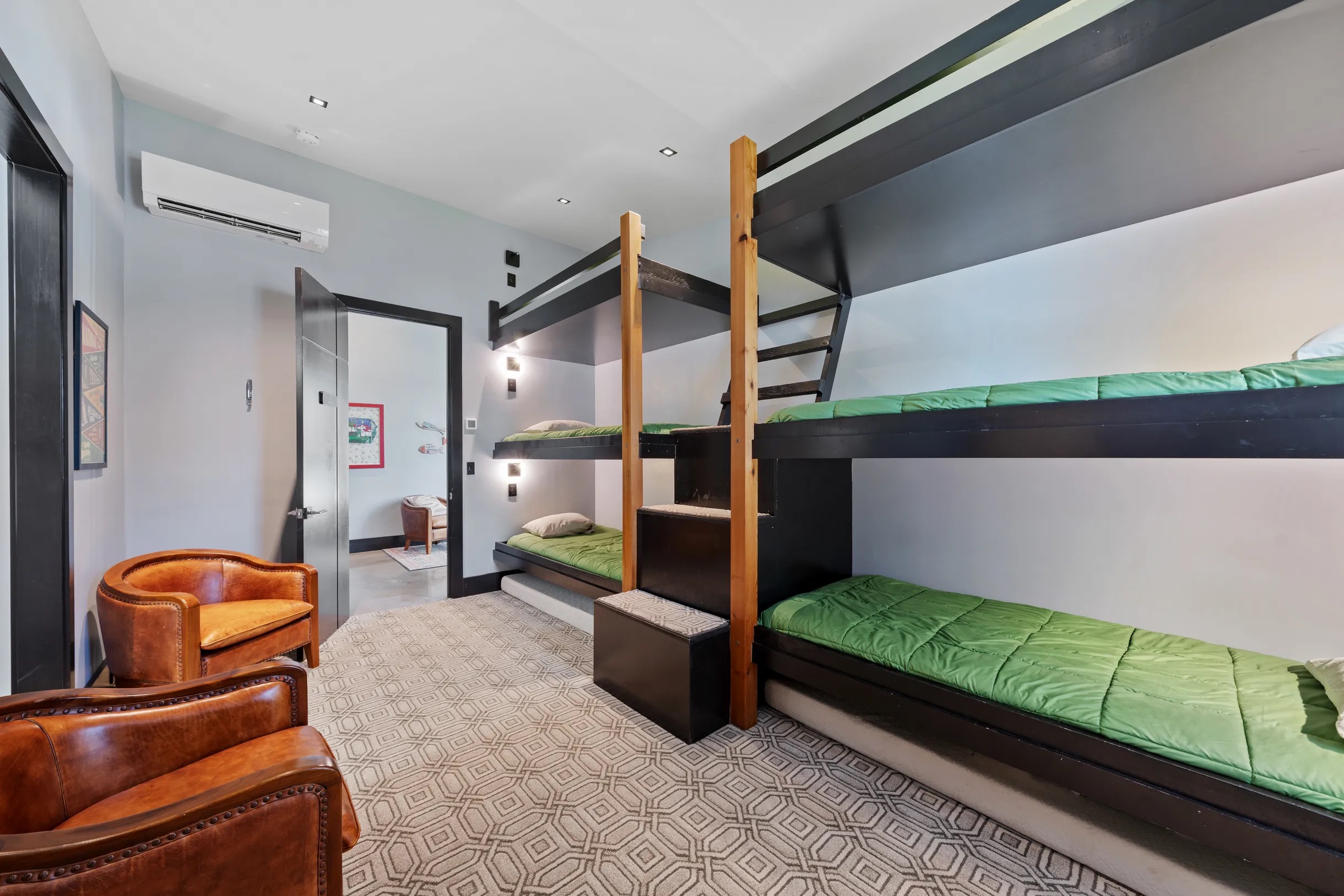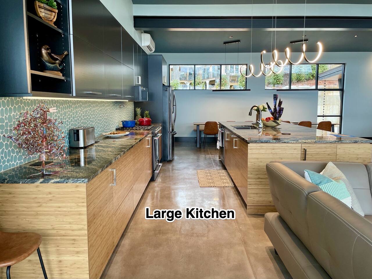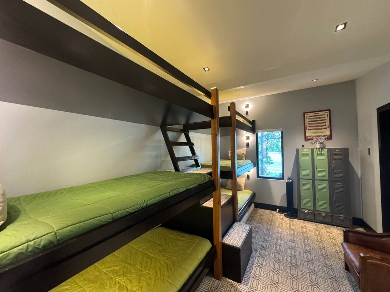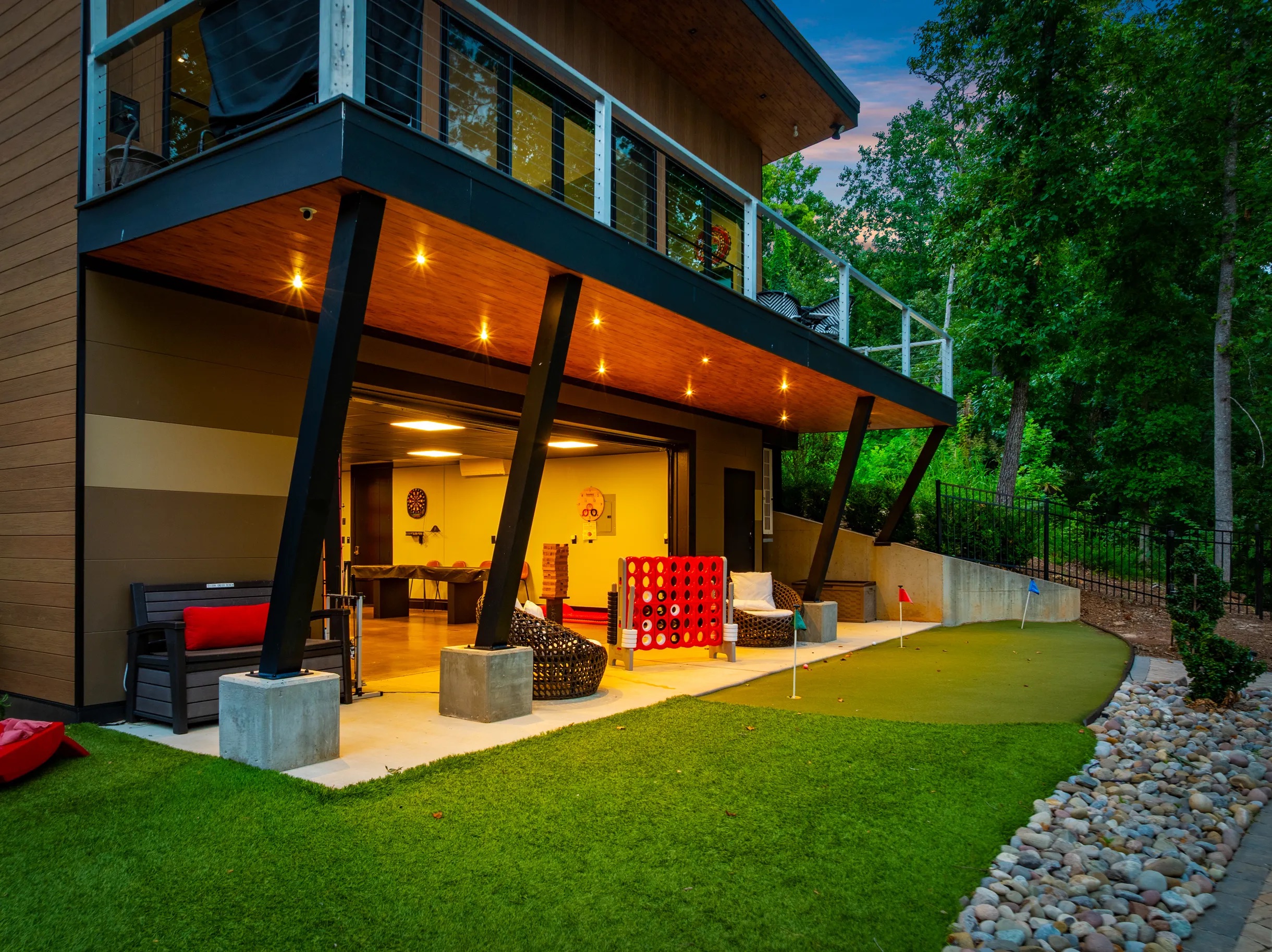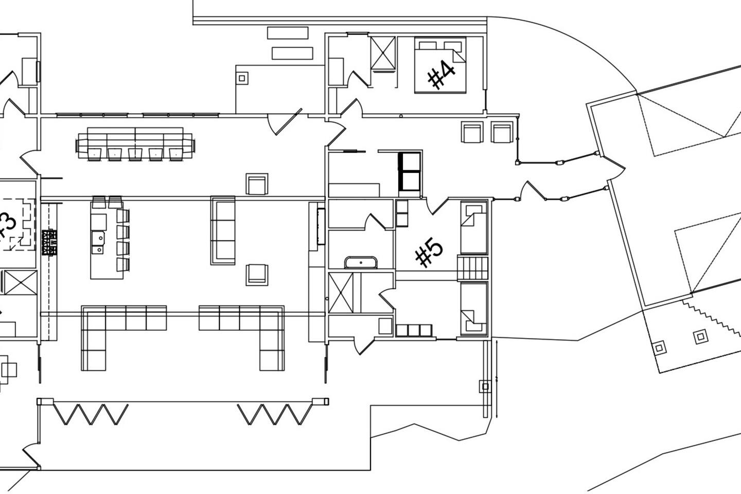 Cook and dine in the 1200 square foot great room with a fully equipped kitchen, separate beverage bar, dining table seating 12, kitchen bar seating 6. Afterward, relax on the couch in front of the 36' glass wall looking out on the lake or get closer to nature on the screened porch with fireplace or sit around the outside fire pit only feet from the water's edge where you have excellent views of the sunset over the water. Six bedrooms feature king beds, and a bunk room with 6 bunks and 2 mobile mattresses perfect for the kids and kids at heart alike. Outside features ample parking, 3000SF of turf, and a putting green all surrounded by beautiful trees and the lake. You will also have access to a dock where you can dock your own (or a rental) boat or jetski during your visit. Exterior cameras on and around the house are in use for the security of the property and our guests.